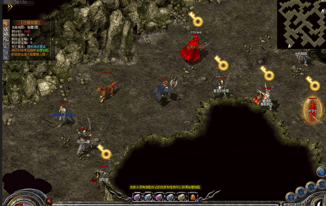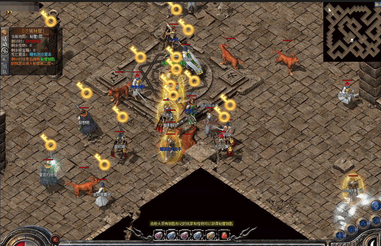 本玩法一共3层,在1、2层击败怪物或其他拥有钥匙的玩家都可以获得“秘窟钥匙”,持有秘窟钥匙方可进入下一层。