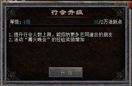 1.升级目的: 会长可以通过消耗积累的行会活跃点提升行会等级。提升行会成员人数上限,壮大行会力量!