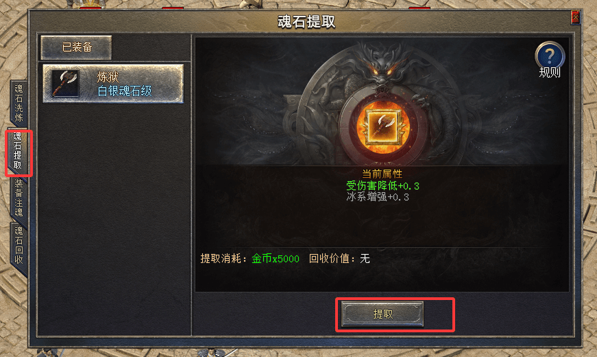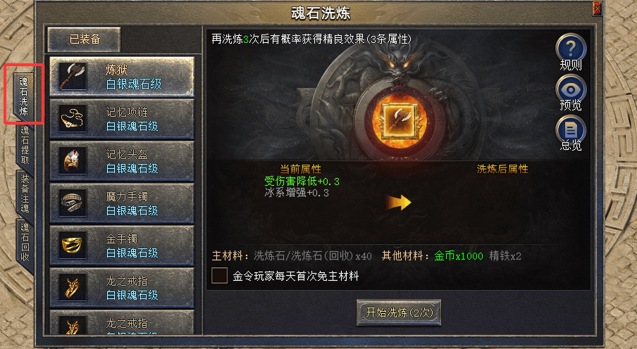 1、功能概述:将装备已洗炼出的属性提取为“魂石”道具,魂石部位与原装备一致。