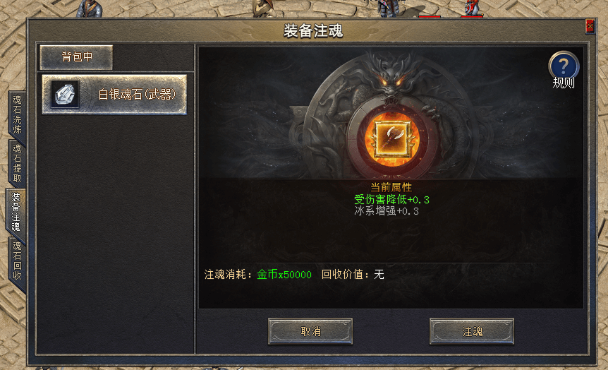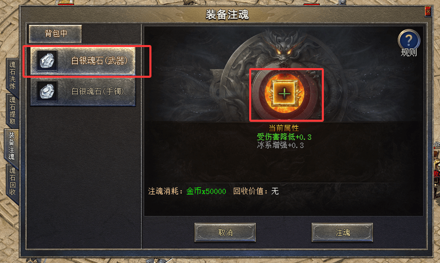 1、功能概述:通过将“魂石”镶嵌到目标装备上,使其洗炼属性生效。