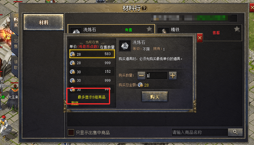 ②售卖物品最多显示五组,购买物品时最先从最低价开始购买