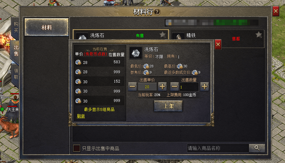 1.功能概述:玩家可将道具:“洗炼石”、“精铁”进行上架出售